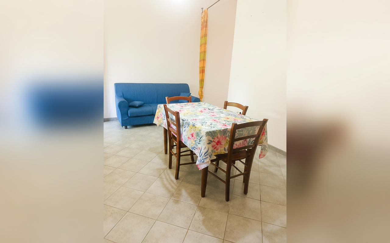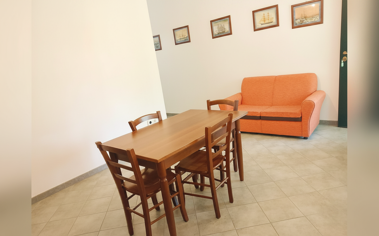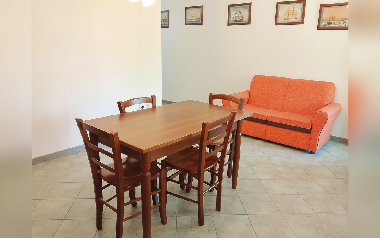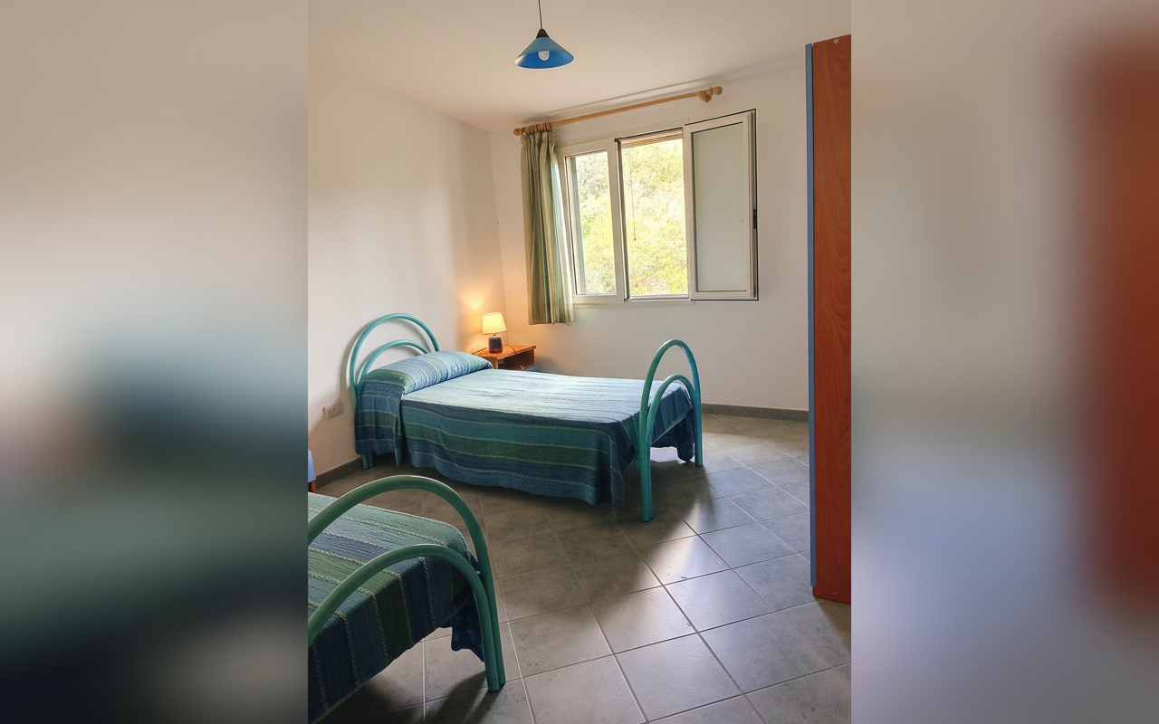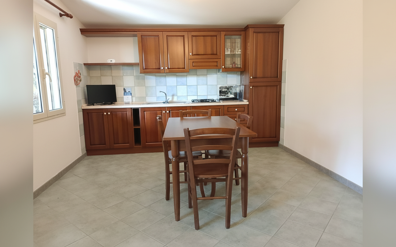 Appartamento composto da una camera matrimoniale alla francese, una camera con due letti singoli, bagno privato e cucina completa. Gli spazi sono ampi e funzionali, ideali per famiglie o piccoli gruppi fino a 4 persone. Dotato di veranda e affacciato su giardino e natura circostante, è perfetto per vivere il soggiorno in totale relax e autonomia.